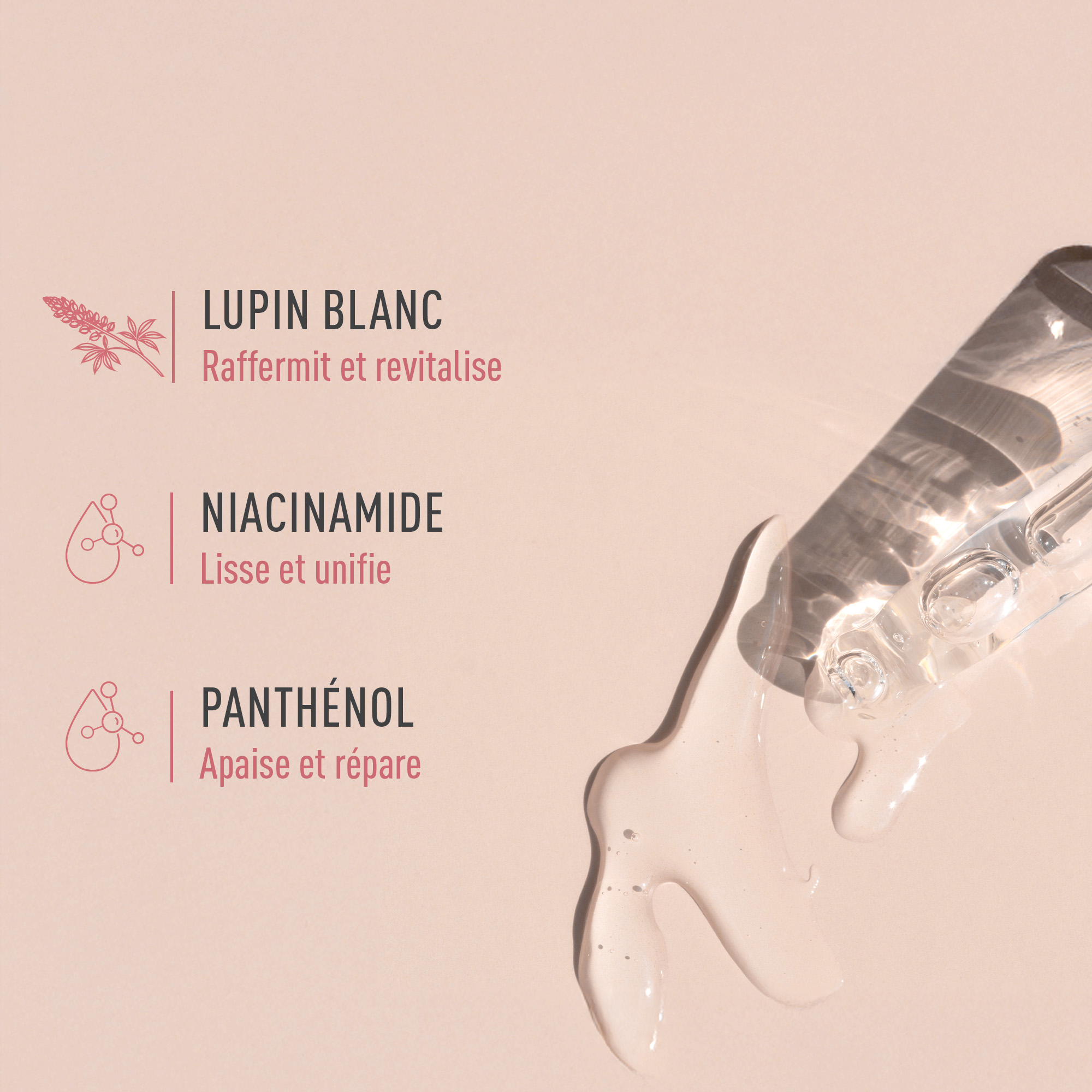 INGRÉDIENTS : AQUA (WATER), PROPANEDIOL, HYDROLYZED LUPINE PROTEIN, CAPRYLYL/CAPRYL GLUCOSIDE, NIACINAMIDE, GLYCERIN, SODIUM BENZOATE, PARFUM (FRAGRANCE), SODIUM GLUCONATE, PANTHENOL, PROPYLENE GLYCOL, ALPHA-GLUCAN HYDROXYPROPYLTRIMONIUM CHLORIDE, PANTOLACTONE, ACHILLEA MILLEFOLIUM EXTRACT, POTASSIUM SORBATE, OLEA EUROPAEA FRUIT OIL, ZINGIBER OFFICINALE ROOT EXTRACT, CITRIC ACID, CITRUS LIMON PEEL OIL, LIMONENE, LINALOOL, PINENE, TERPINEOL.